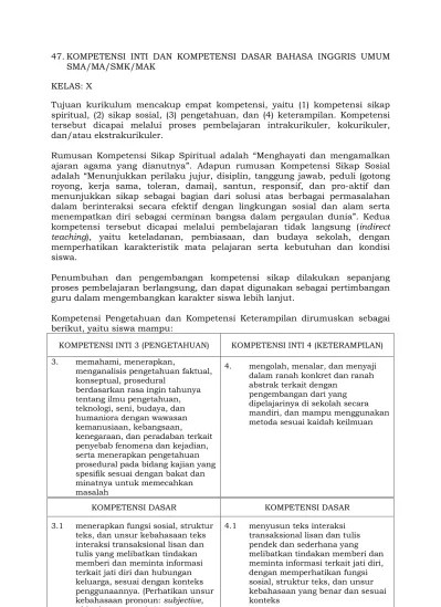 Pendidikan budaya dan karakter bangsa. Kompetensi inti (ki) dan kompetensi dasar (kd) bahasa inggris peminatan sma/ma kurikulum 2013 ini merupakan edisi revisi tahun 2017. File perangkat pembelajaran yang admin bagikan pada kesempatan artikel ini yaitu untuk jenjang sekolah menengah atas sma dan madrasah aliyah . Ki kd pelajaran bahasa inggris smk/mak kurikulum 2013 k13 revisi terbaru, kompetensi inti. Dalam mata pelajaran lain di kelas xi, sesuai dengan konteks penggunaannya.